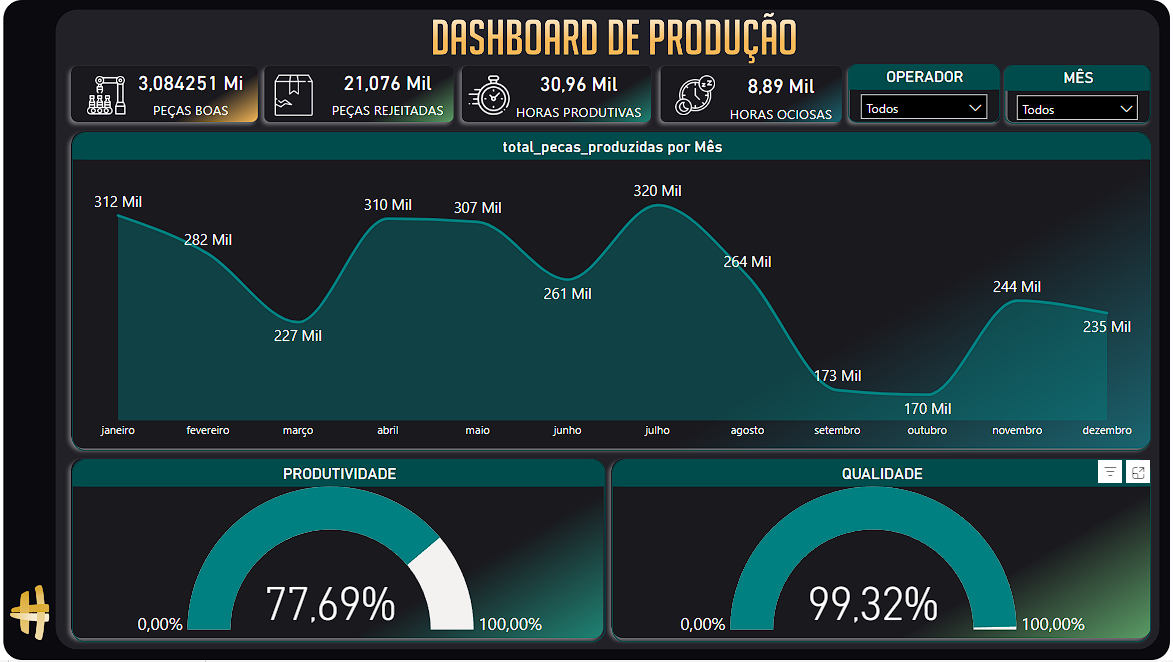 Este painel acompanha a eficiência da produção industrial, monitorando a produtividade, qualidade e ritmo de trabalho ao longo dos meses. Ele fornece insights sobre o desempenho operacional e ajuda a identificar oportunidades de melhoria.