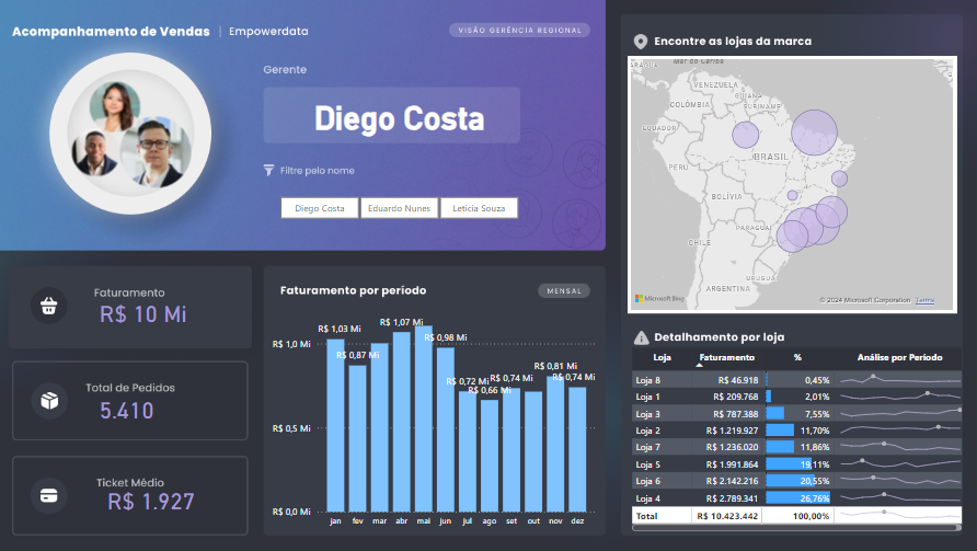 Dashboard desenvolvido no Power BI para acompanhamento de vendas, com uso de filtros, funções DAX e Figma para monstagem do layout.