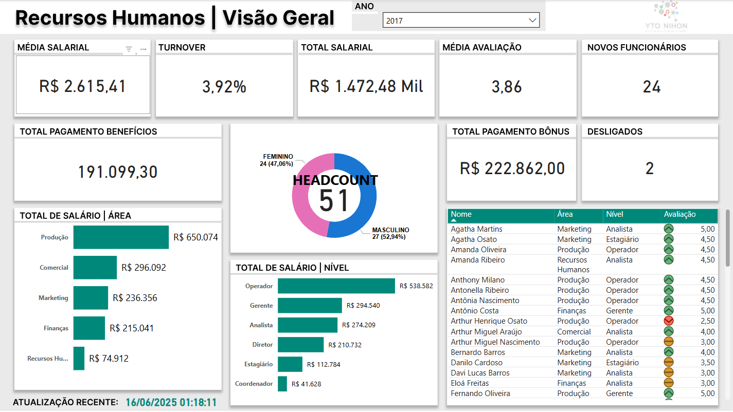 Este dashboard de Recursos Humanos | Visão Geral apresenta uma análise consolidada dos principais indicadores de RH da empresa para o ano de 2017. Abaixo está um resumo das informações e insights relevantes.
